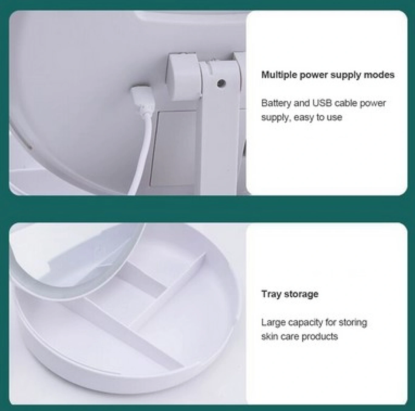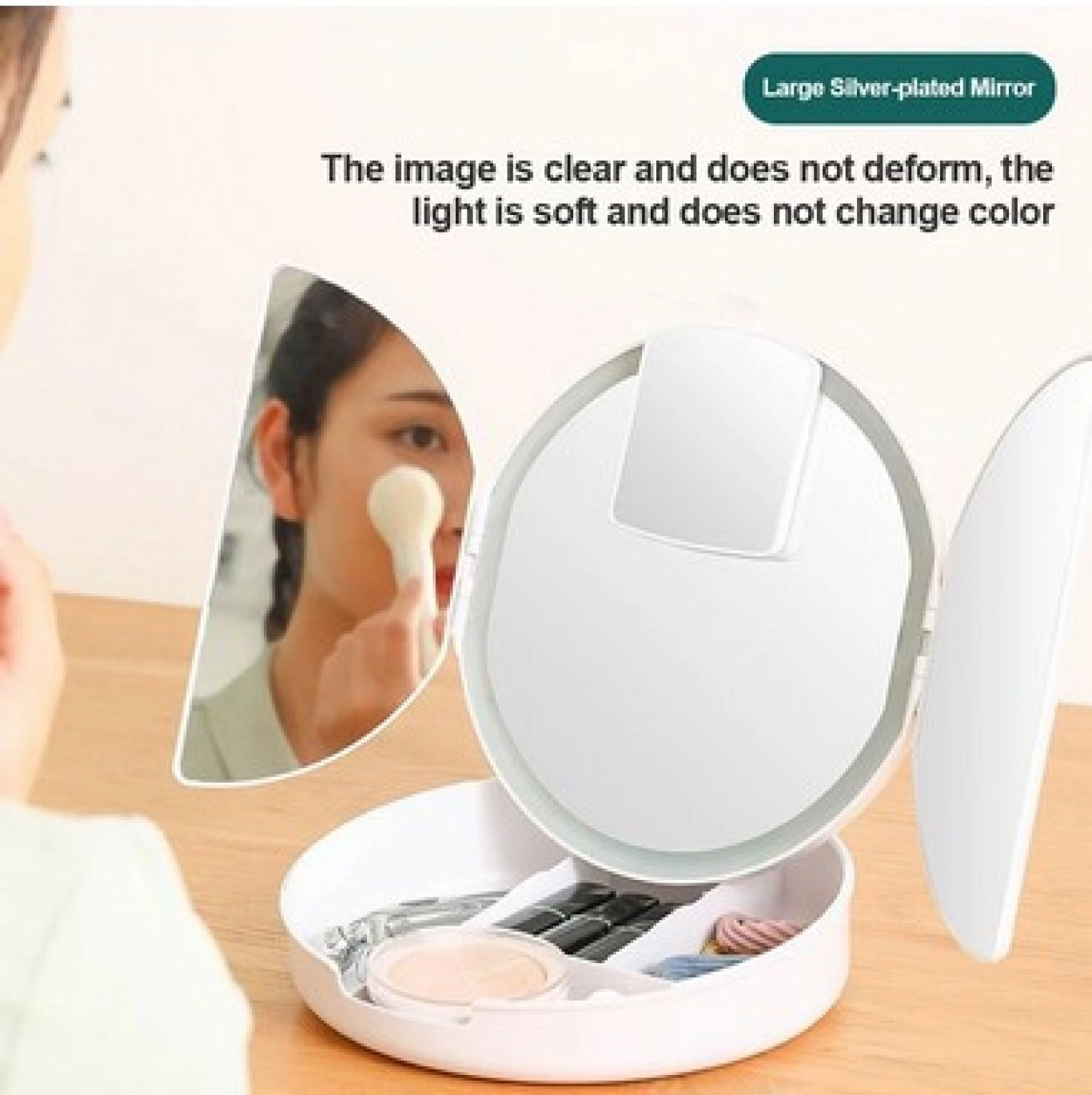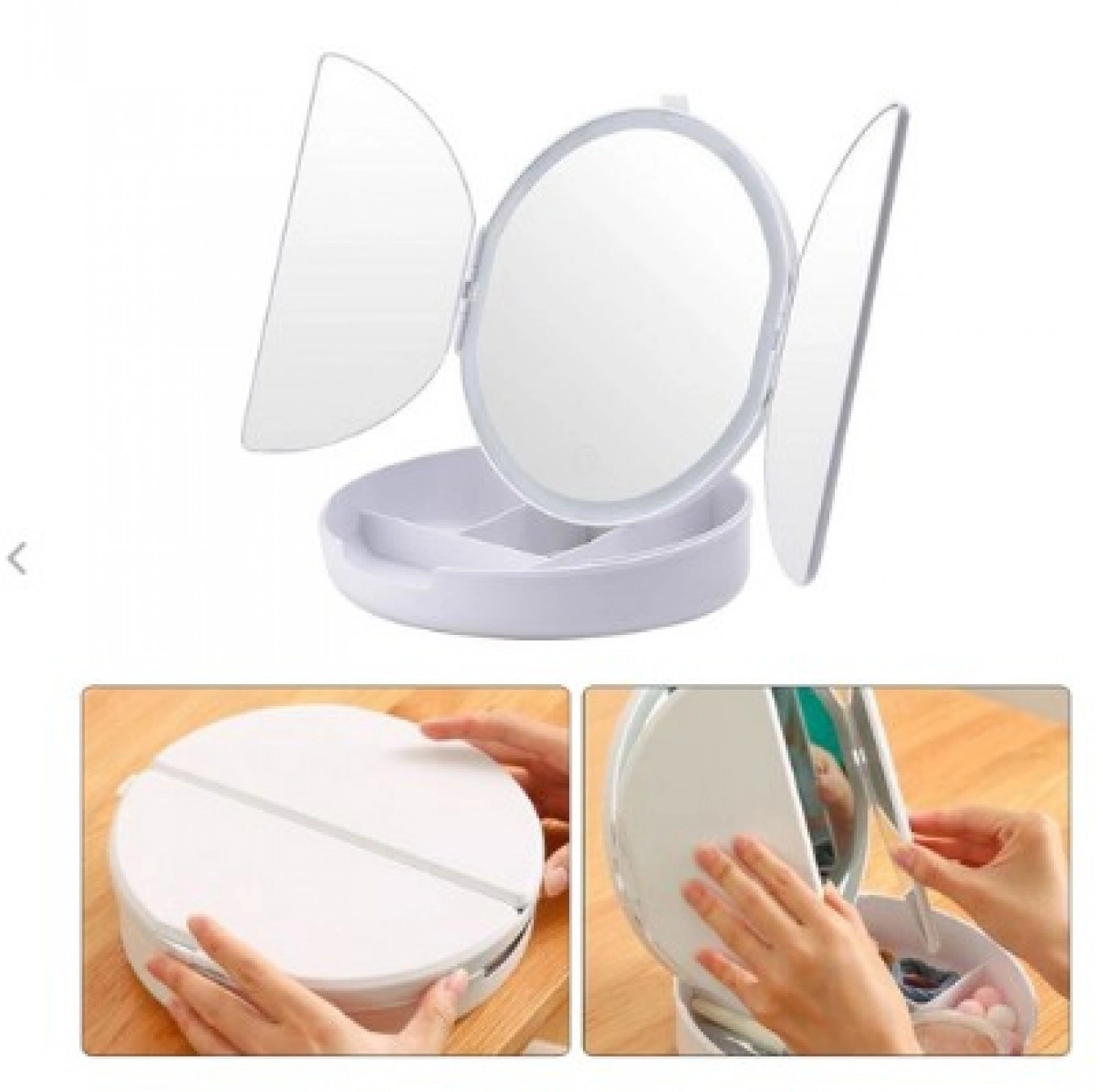 Εργαλείο ομορφιάς το οποίο προσφέρει θήκη για το μακιγιάζ σας και μεγέθυνση 5Χ που σε συνδυασμό με τον δυνατό φωτισμό LED κάνει την προσοχή στην λεπτομέρεια.✔️Foldable για Εύκολη ΜεταφοράΧωρισμένος σε 3 τμήματα διπλώνει και ξεδιπλώνει εύκολα σαν «βιβλίο» για να μην πιάνει χώρο όταν δεν τον χρειάζεστε. Περιστρέφεται 180 μοίρες, σας δίνει πρόσβαση σε κάθε λεπτομέρεια του προσώπου σας για τέλειο μακιγιάζ κάθε στιγμή που το χρειάζεστε.✔️Θήκη για Μακιγιάζ στο ΕσωτερικόΌταν ξεδιπλώσετε τον καθρέφτη σας, στο εσωτερικό του θα βρείτε μία θήκη με πολλές θέσεις για όλα τα απαραίτητα μακιγιάζ σας, ώστε να τα έχετε μαζί σας πάντα και παντού!✔️Είναι ένας συμπαγής, φορητός καθρέφτης με μια τρισδιάστατη, υψηλής ευκρίνειας προβολή που κάνει τα πάντα εύκολα. Οι ενσωματωμένοι αποθηκευτικοί χώροι σας επιτρέπουν να αποθηκεύσετε όλα τα πινέλα, το μακιγιάζ και τα κοσμήματά σας εύκολα, ώστε να μπορείτε να τα χρησιμοποιήσετε άμεσα και εύκολα.✔️Τροφοδοτείται από 4 ΑΑΑ Μπαταρίες (δεν παρέχονται) αλλά και από θύρα USB για να μπορείτε να τον έχετε παντού μαζί σας, τροφοδοτώντας το ακόμη και με powerbank (καλώδιο περιλαμβάνεται).✔️LED Φωτισμός Αφής Ο καθρέφτης έχει ενσωματωμένα φώτα LED που καθιστούν τα πάντα πιο καθαρά και σας βοηθάει να δείτε και τη μικρότερη λεπτομέρεια! Ο φωτισμός ενεργοποιείται με ένα άγγιγμα.