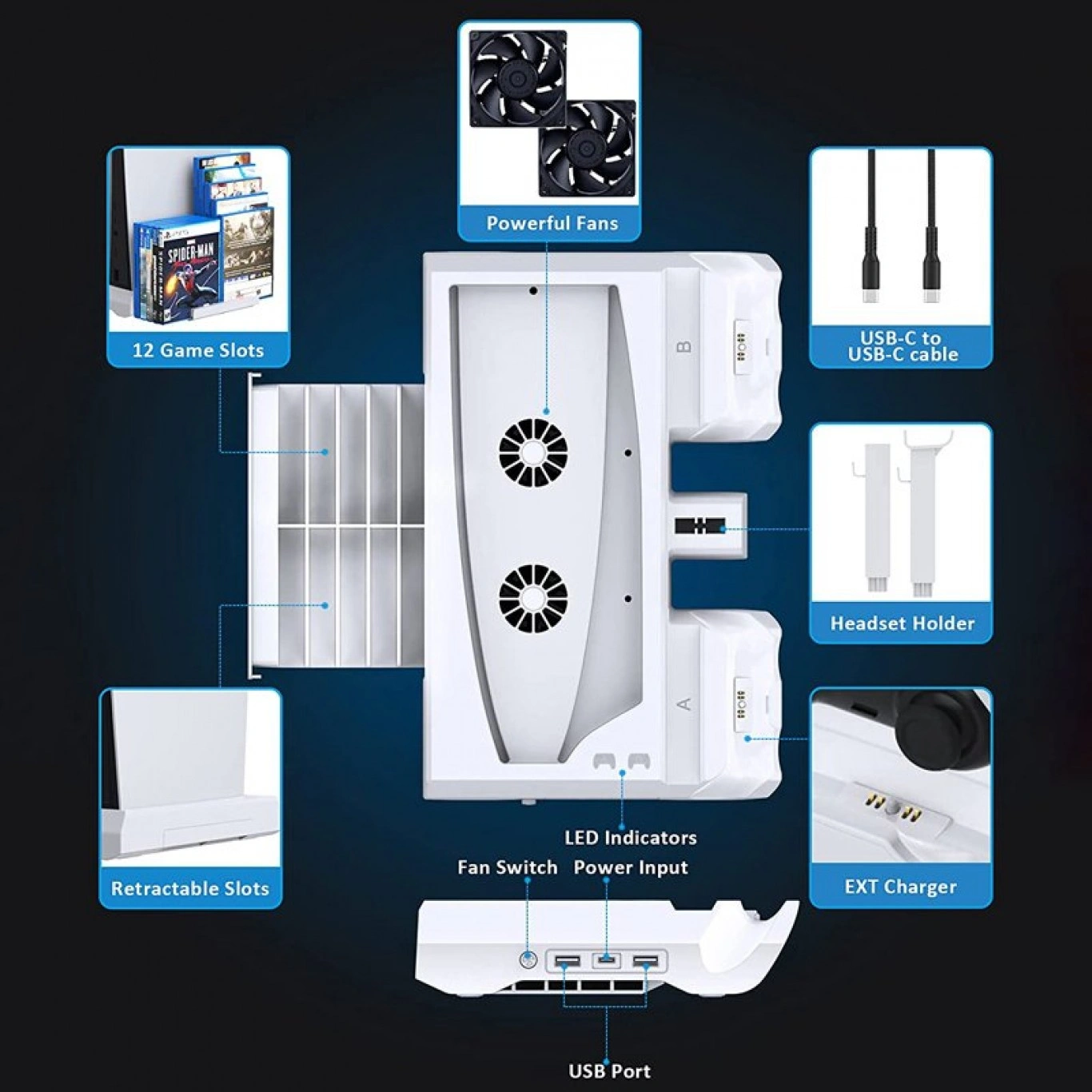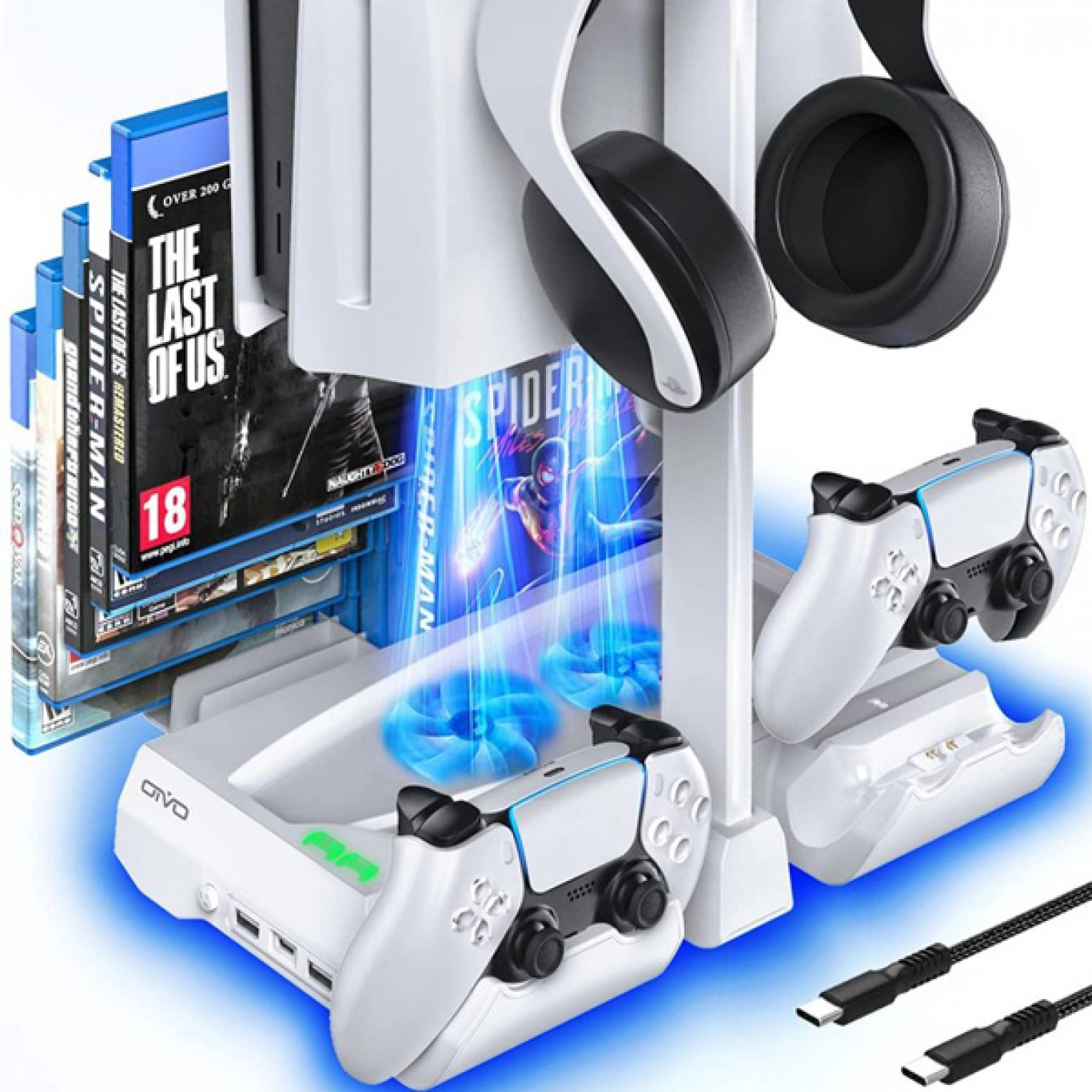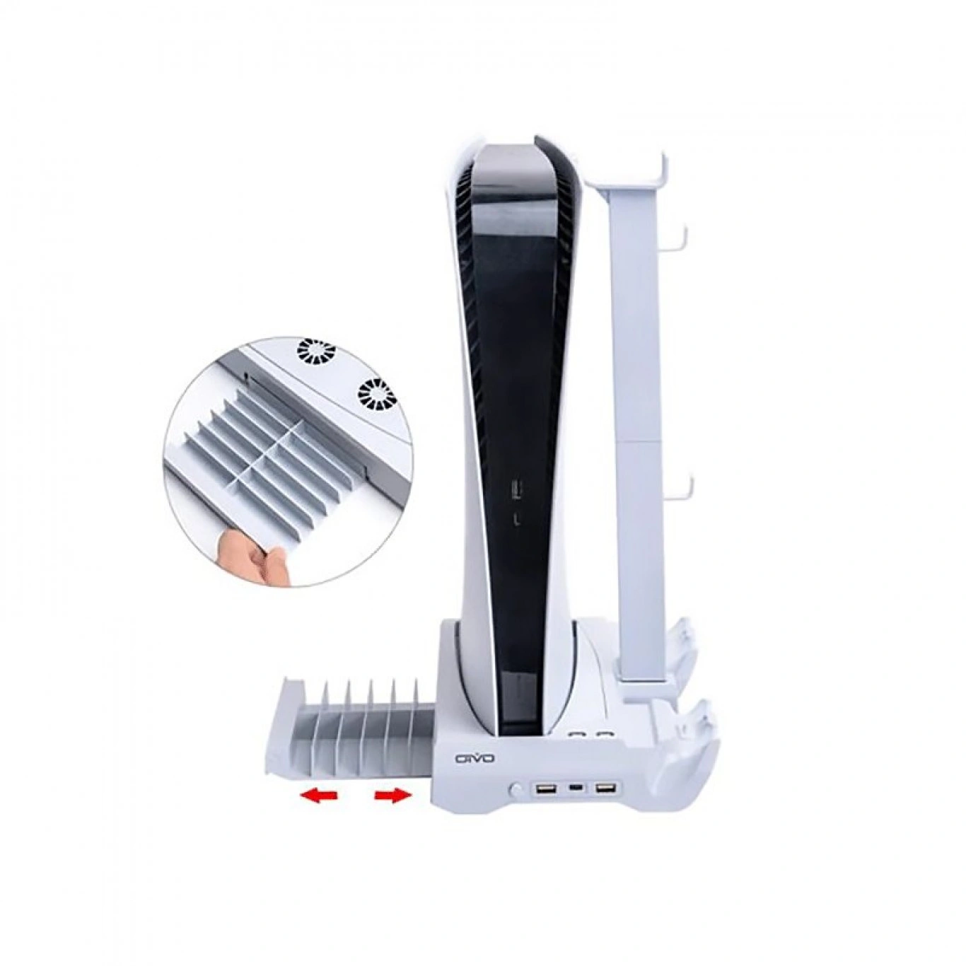 Βάση 4 σε 1 Ψύξης PS5 με Ενσωματωμένη Βάση Γρήγορης Φόρτισης 2 Χειριστηρίων, Θέση για Ακουστικά & Κρυφή Συρόμενη Βάση 12 Παιχνιδιών, OIVO IV-P5249