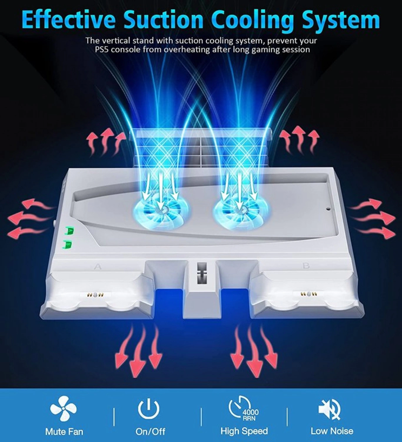 ✔️Η βάση έχει ενσωματωμένα 2 ανεμιστηράκια χαμηλού θορύβου που ρουφούν τον ζεστό αέρα από το κάτω μέρος της κονσόλας και διαχέει τη θερμότητα προς όλες τις κατευθύνσεις για να μεγιστοποιήσει τη διάρκεια ζωής του αγαπημένου σας PS5.