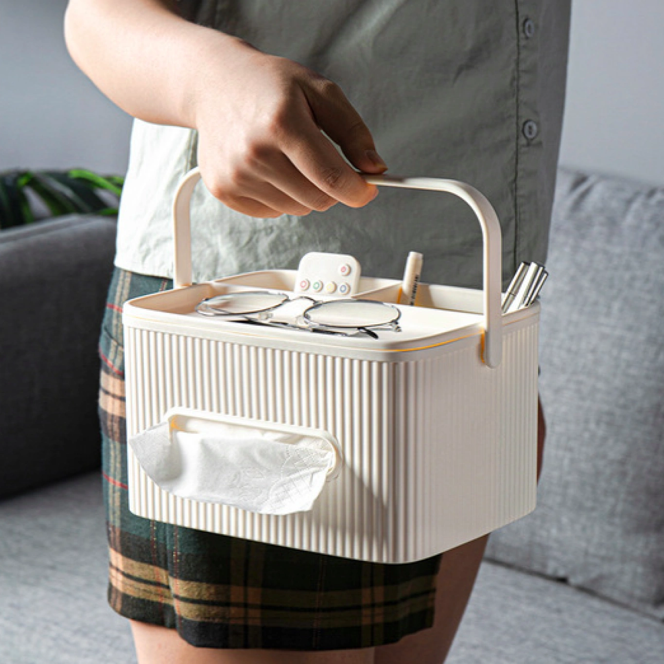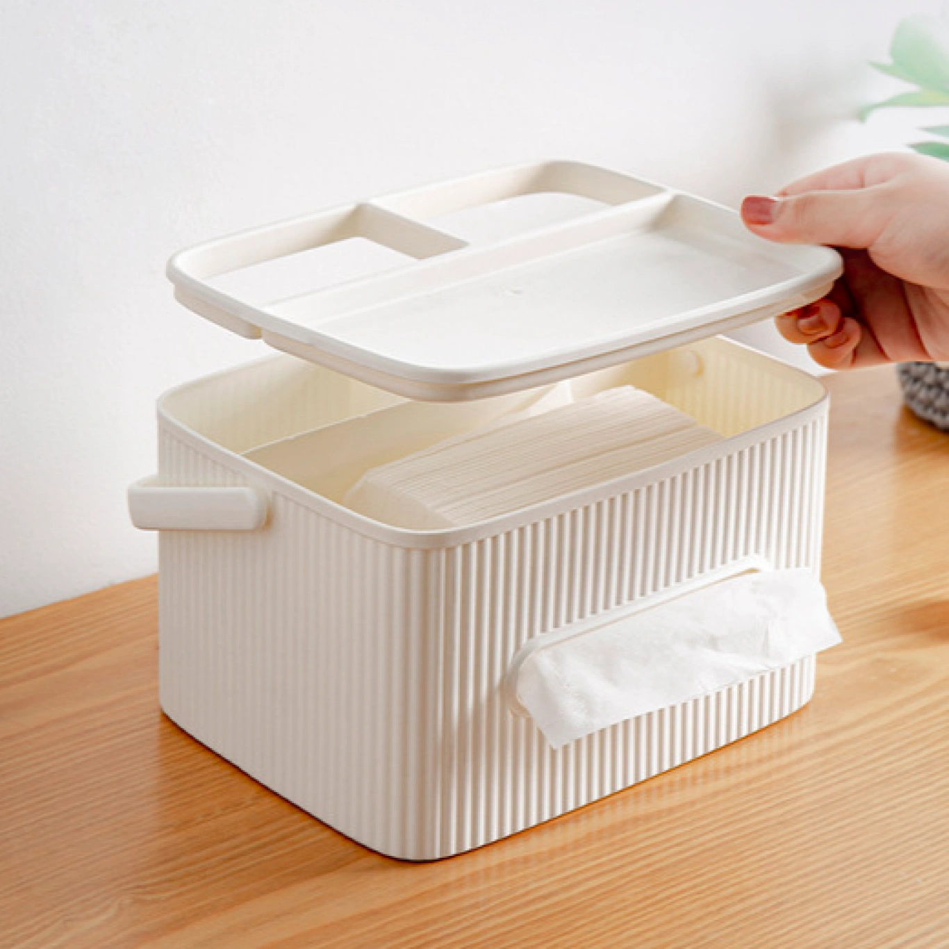 Μία ιδιαίτερη θήκη για χαρτομάντηλα σε λευκό χρώμα, κατάλληλη για να τα προστατεύει από σκόνη, αλλά και για την οργάνωση μικροαντικειμένων.