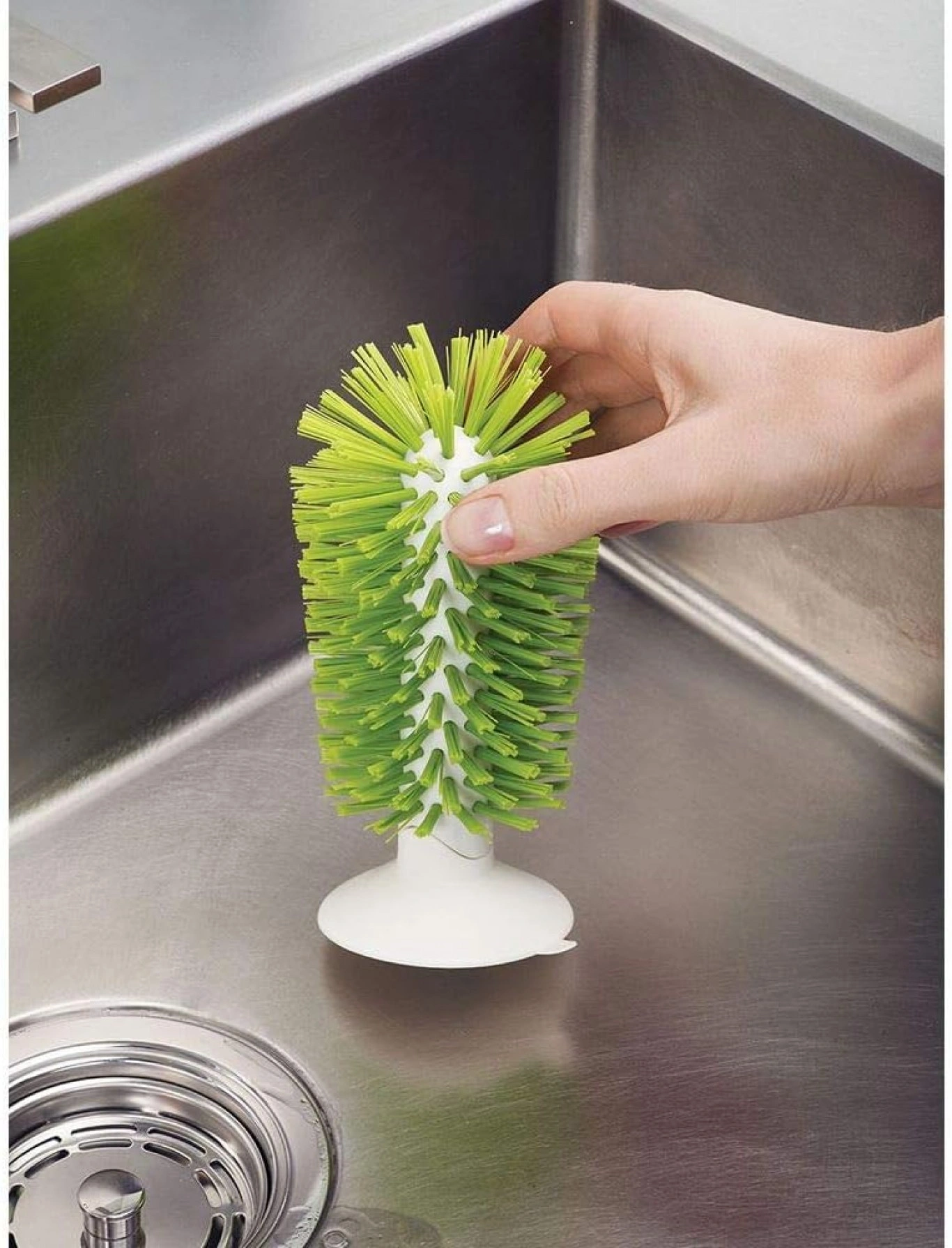 Η βεντούζα της βούρτσας επιτρέπει την εύκολη προσκόλληση στον πάτο του νεροχύτη, εξασφαλίζοντας σταθερότητα κατά τη χρήση.